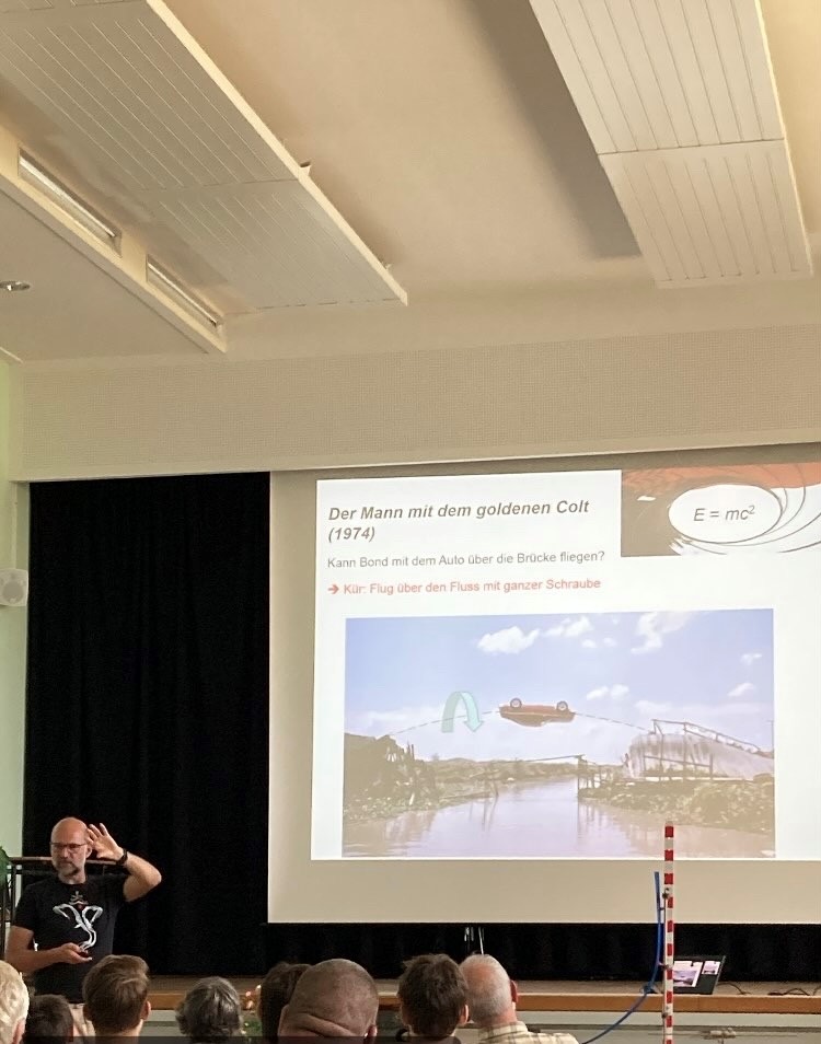 Rund 45 Besucher:innen fanden bei hochsommerlichen Temperaturen den Weg in die Aula des Schwedter Gauß-Gymnasiums. Prof. Daniel Huster hat es geschafft, sein Publikum für Physik und Naturwissenschaften zu begeistern. Er zeigte mehrere kurze Clips aus verschiedenen James Bond Filmen und erklärte anhand dieser, wie realistisch die beeindruckenden Stunts des Geheimagenten sind und welche Berechnungen oder Vorkehrungen für deren Gelingen im Vorfeld nötig wären.