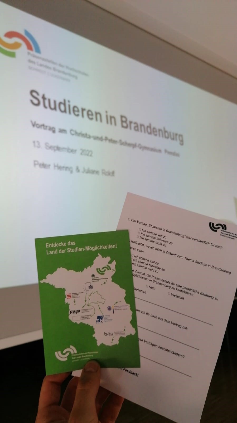 Am Dienstag, den 13.09.2022, präsentierte unsere Präsenzstellenleiterin Juliane Roloff und Peter Hering, wissenschaftliche Hilfskraft, Möglichkeiten zum Studieren in Brandenburg sowie unsere Beratungs- und Informationsangebote am Prenzlauer Gymnasium. Mehr als 20.000 Studiengänge gibt es aktuell in Deutschland. 350 davon werden in Brandenburg angeboten. Die 70 Schüler*innen der 12. Klassen erfuhren viele nützliche Tipps und Hinweise zu bestehenden Angeboten sowie zum Thema Studienfinanzierung.