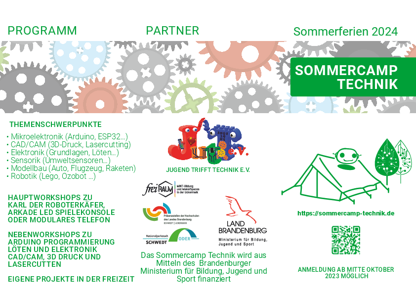 Entdecke die Welt der Technik im Sommercamp in Schwedt! Innerhalb einer Woche können sich Jugendliche mit den Themenschwerpunkten Mikroelektronik (Arduino, ESP32), CAD/CAM (3D-Druck, Lasercutting), Elektronik (Grundlagen, Löten), Sensorik (Umweltsensoren), Modellbau (Auto, Flugzeug, Raketen), Robotik (Lego, Ozobot) beschäftigen. In spannenden Workshops erwerben die Teilnehmenden Kenntnisse in Programmierung, Löten, Elektronik, 3D und Lasercutten.